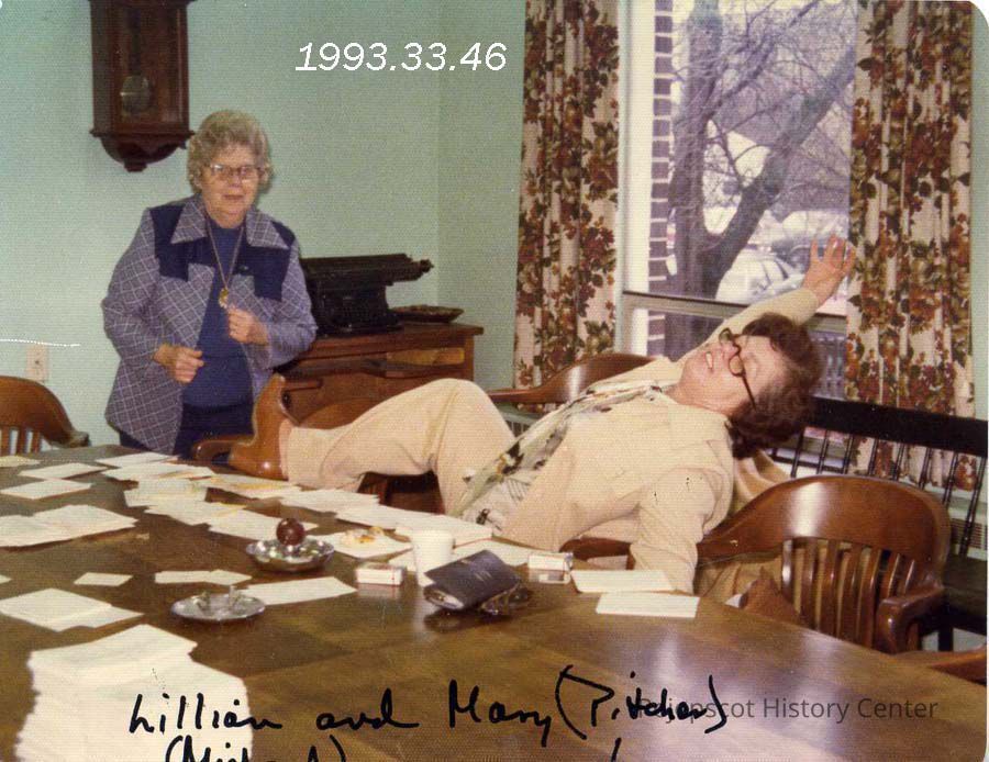 A color photograph taken in the conference room at Town Hall on Federal St., Lillian Michaud and Mary Pitcher were Board of Voter Registration Democrats, Nov. 1976
