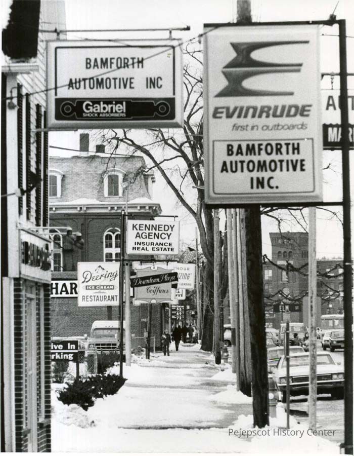 A photo of Maine St. Bamforth's Automotive to Fort Andross (telephoto lens). c.1970