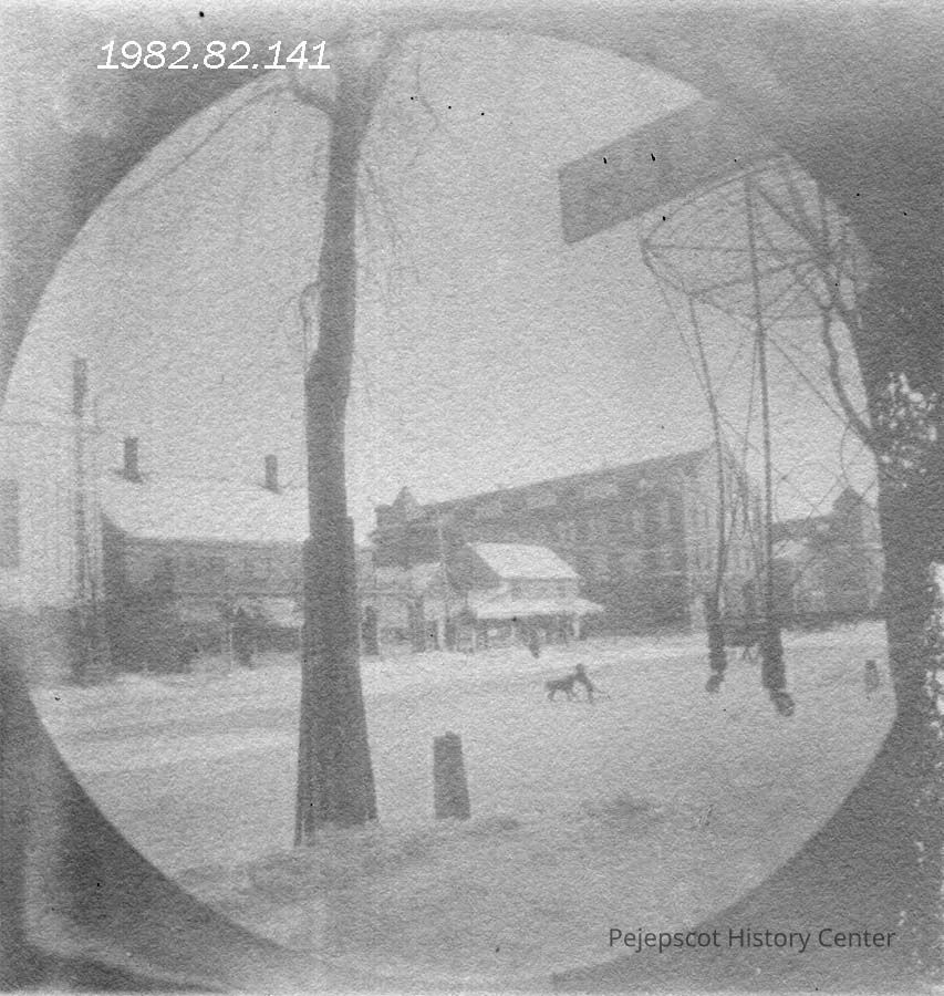 A B/W photograph of Maine St. Brunswick. The Dunlap Block can be seen. There are two dogs fighting in the foreground.
