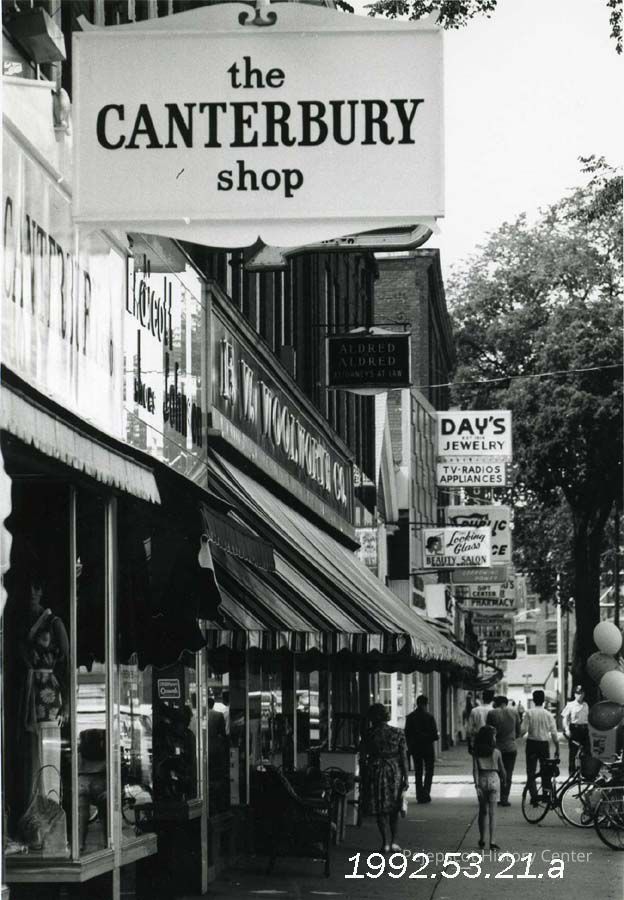 A B/W photograph of Maine St., c.1970, showing Canterbury Shop and F. W. Woolworth's store.