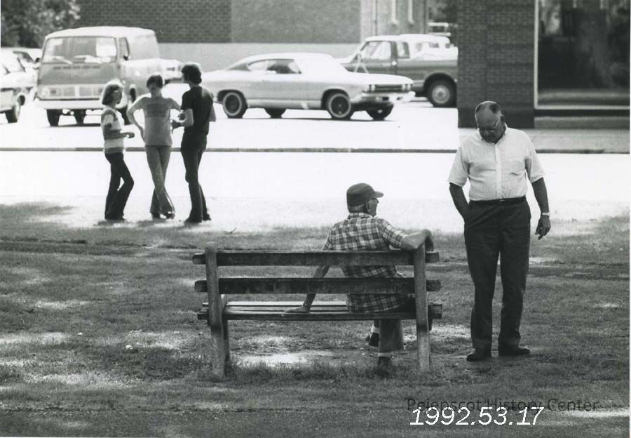 A B/W photograph of Maine St. from the Mall, c.1970 with the New England Telephone Building and Everett St. in background and pilaster of 156 Maine St. on right.