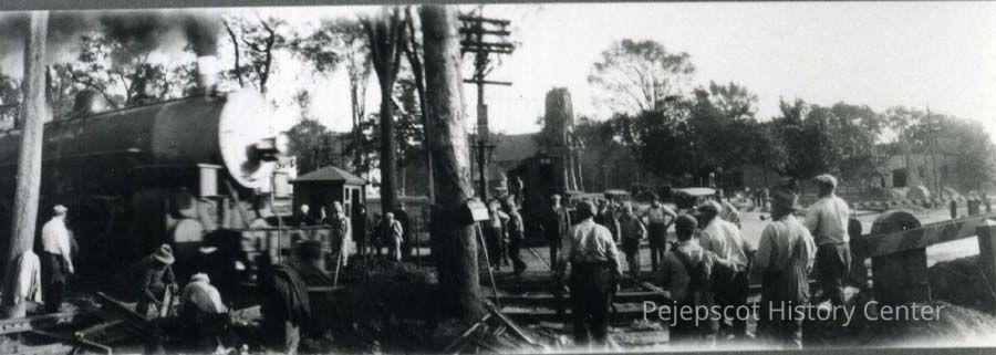 A B/W photograph of a group of men working on Maine St. at the RR & Trolley lines crossing. First Parish Church can be seen in the background.