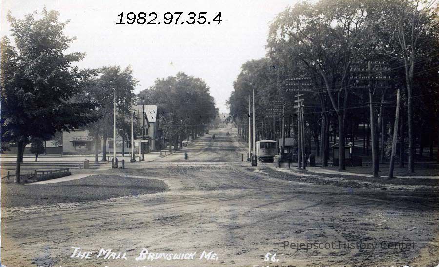 A B/W photograph looking north on Maine Street and the Mall can be seen on the right.Collection