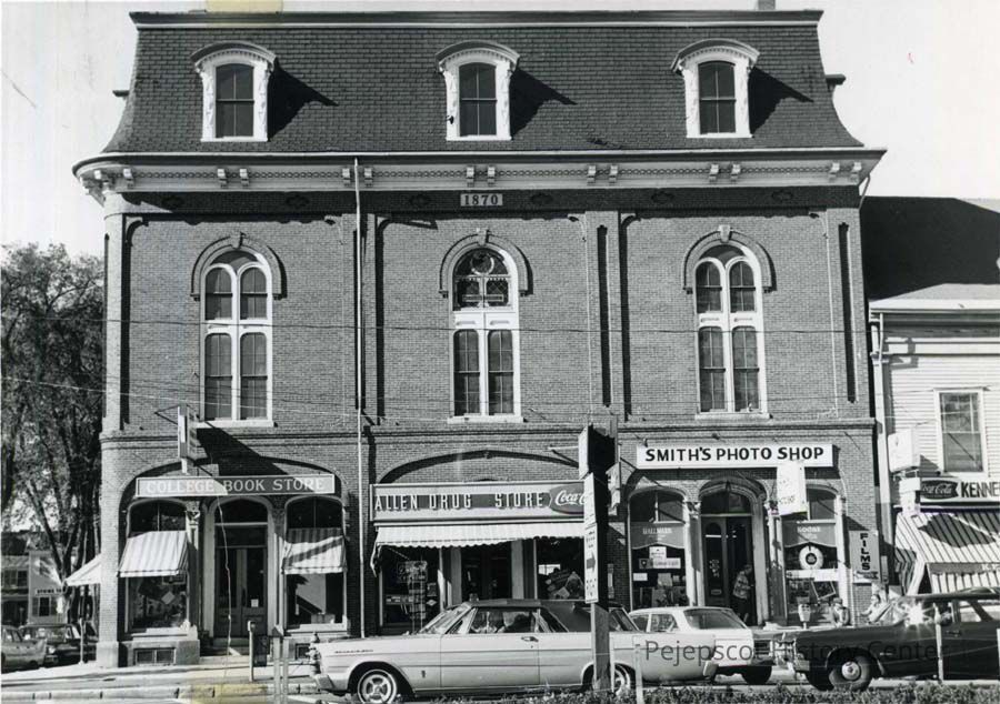 A B/W photograph of 144 to 148 Maine Street Brunswick. Shown are the College Book Store, Allen Drug Store and Smith's Photo Shop. C. 1967.