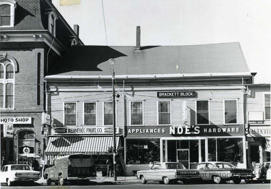 A B/W photograph of 142 - 140 Maine Street Brunswick. Showing the Brackett Block, Kennebec Fruit Co., Noe's Appliances. c. 1967