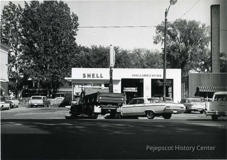A B/W photograph of Maine Street, showing the Shell Service Station. c. 1967.