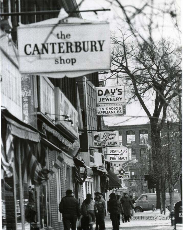 The Canterbury Shop, Streets - Maine, Day's Jewelry, Looking Glass Beauty Salon, Drapeau's Pharmacy, Frosty Donuts, Cabot Mill, Architecture, Brunswick