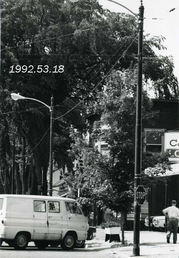 A B/W photograph of Maine Street Ca.1970. With a van parked in front of Day's Variety and Fields Jewelry Store.