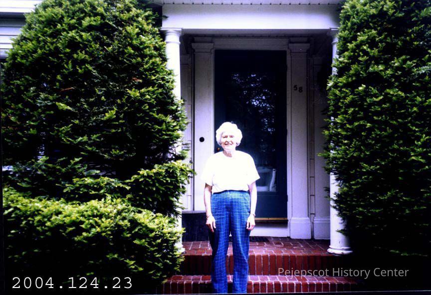 A color photograph of Maria Hanley standing in front of her door at 58 Federal Street.