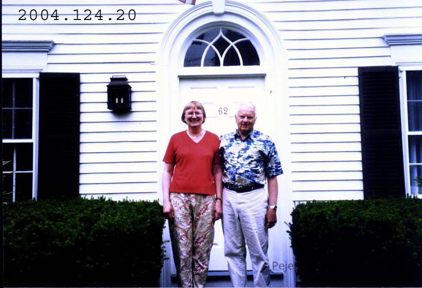 A color photograph of Mary Ann and Austin Treworgy standing at their front door at 62 Federal Street.