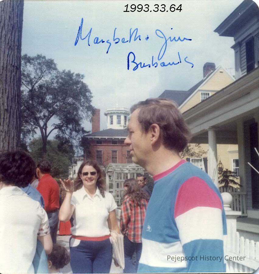 A color photograph of Marybeth and Jim Burbank on Park Row watching the Fireman's Muster. The Skolfield Whittier House can be seen in the background. 9/16/1973.