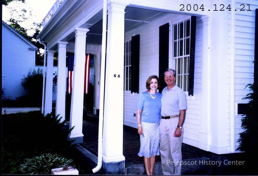 A photo of Megan and Mike Adams standing by their porch at 64 Federal Street.