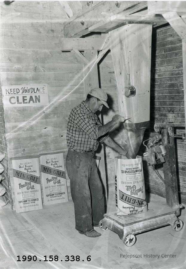 A B/W photograph of men filling bags with poultry grit at Topsham Feldspar Co. 1955.