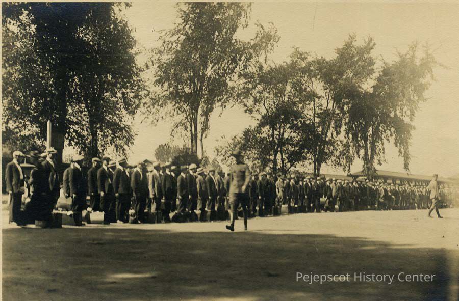 A B/W photograph of men lined up waiting for the train at Brunswick railroad station. WW I