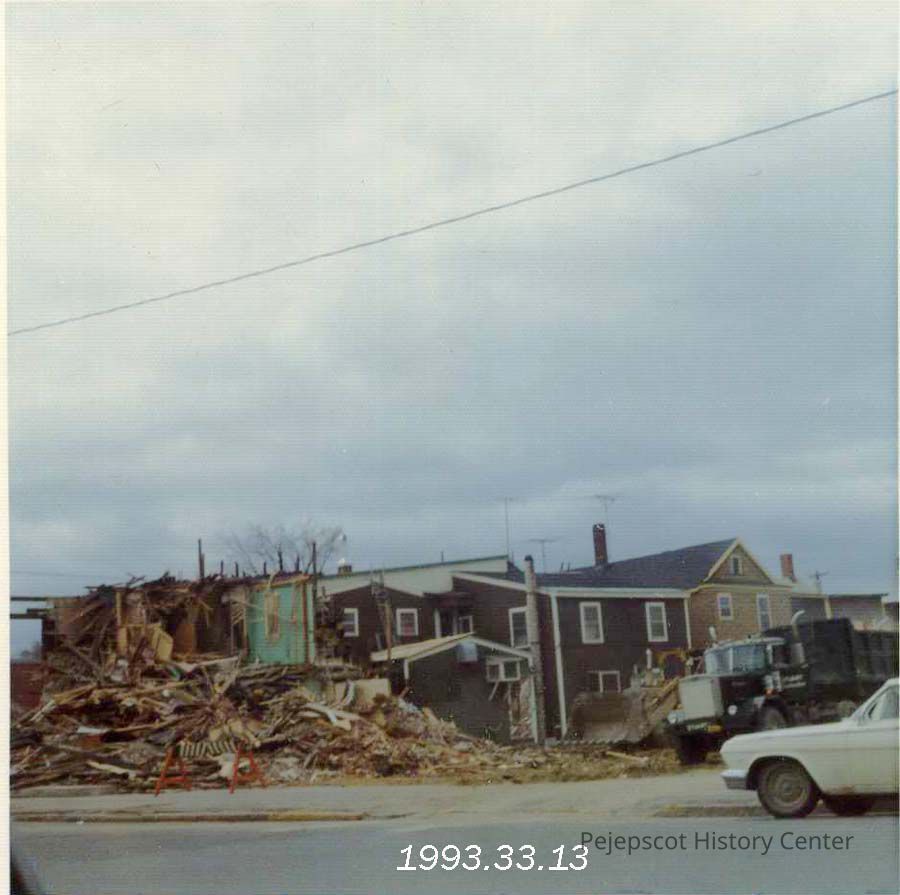 A color photograph of Mike's Lounge being razed. Maine Street is in the foreground. 3/1973