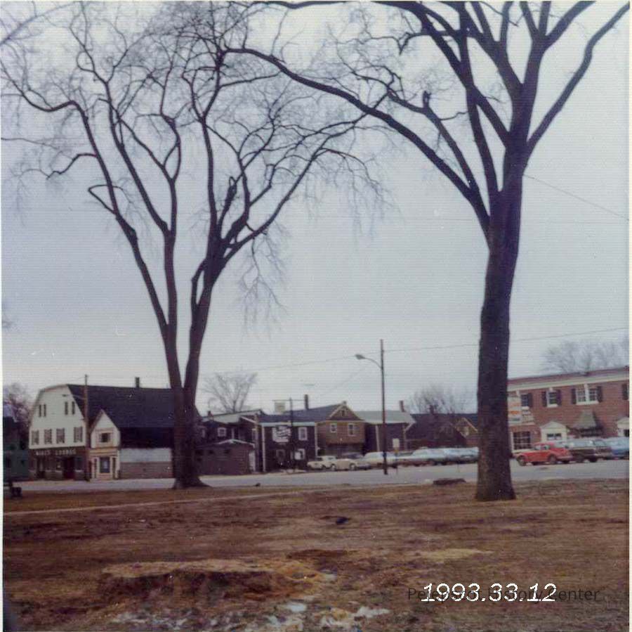 A color photograph of Mike's Lounge and Deering (Ice Cream) parking lot. The Mall is in the foreground. 3/1973