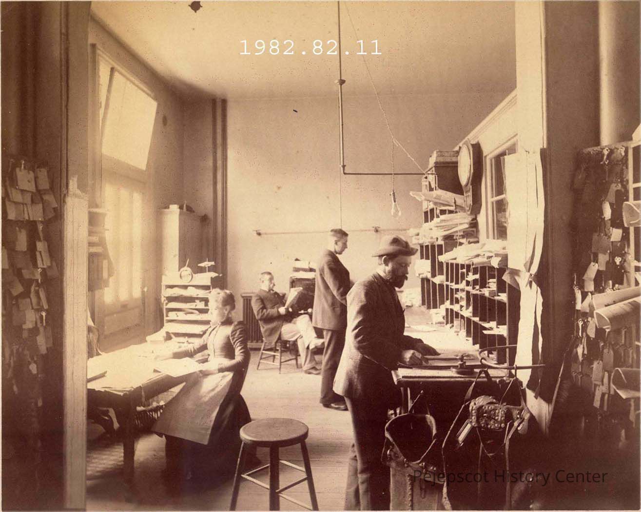 A sepia photograph of an interior scene "Old Post Office in Old Town Hall Bldg. 126-128 Maine Street Brunswick, Me. around 1900. (Written on one side of an attached tag)