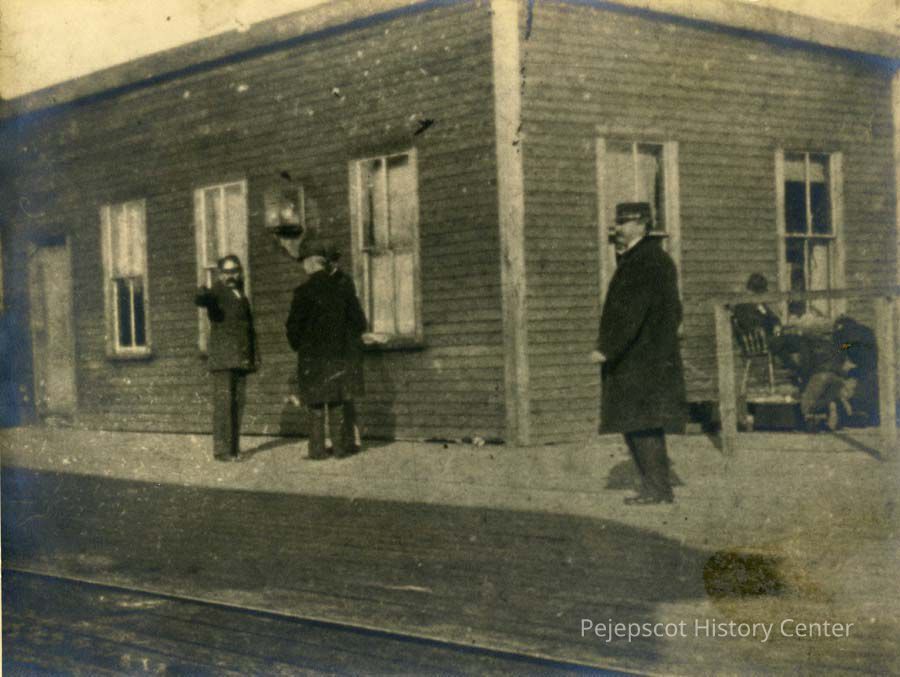 A B/W photograph of Omer & Adjutor Tondreau shining shoes at the first Brunswick railroad station. 1893