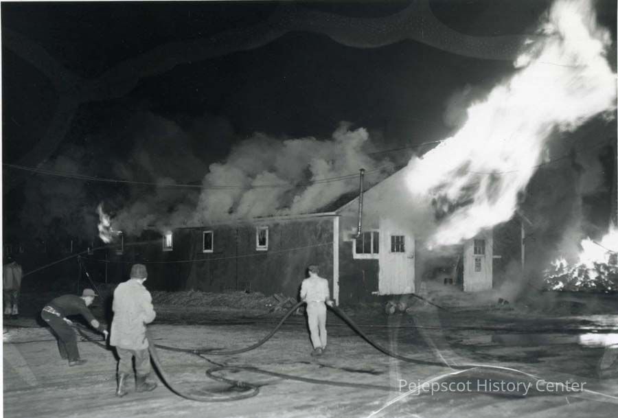 A B/W photograph of one of the animal sheds burning at the Topsham Fair Grounds.
