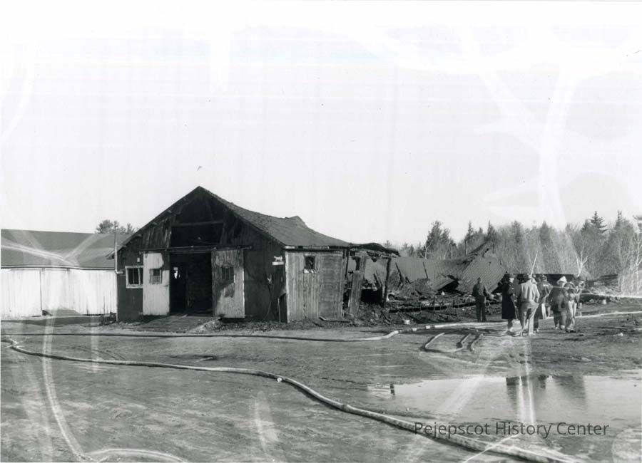 A B/W photograph of one of the animal sheds that burnt at the Topsham Fair Grounds.