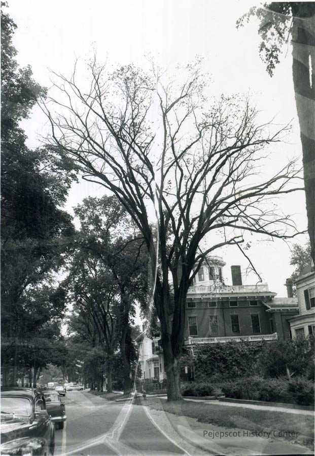 A B/W photograph of 159 Park Row with an Elm tree killed by the Dutch Elm Disease. The Skolfield/Whittier house can be seen in the background.