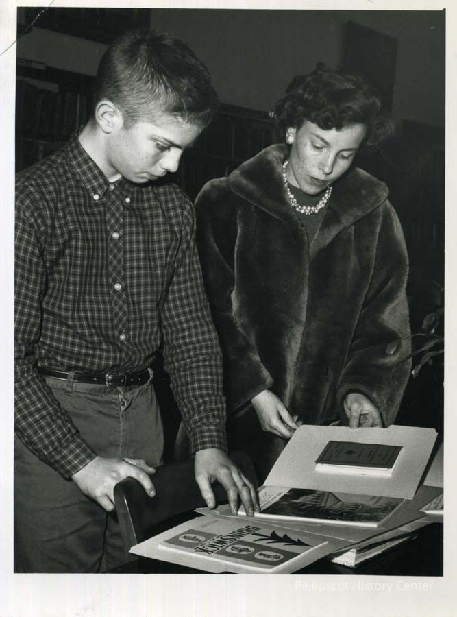 Black and white photo of Randy Greason, working with his teacher, Mrs. Carl Schmalz, Jr., on a project involving photo albums.