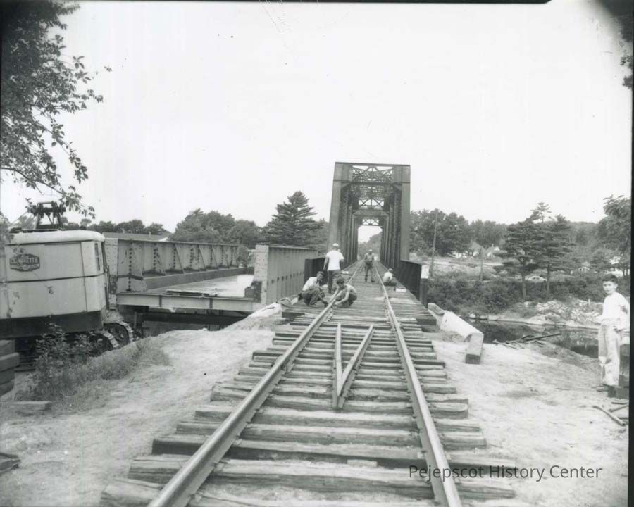 A B/W photograph of repairs being done to the Maine Central Railroad Bridge (Black Bridge) over Mill Street and the Androscoggin River. Likely taken in 1957