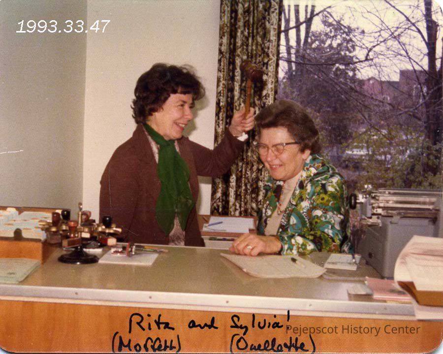 A color photograph of Rita Moffett, Town Clerk, and Sylvia Ouelette in the Town Offices on Federal Street. Nov. 1976