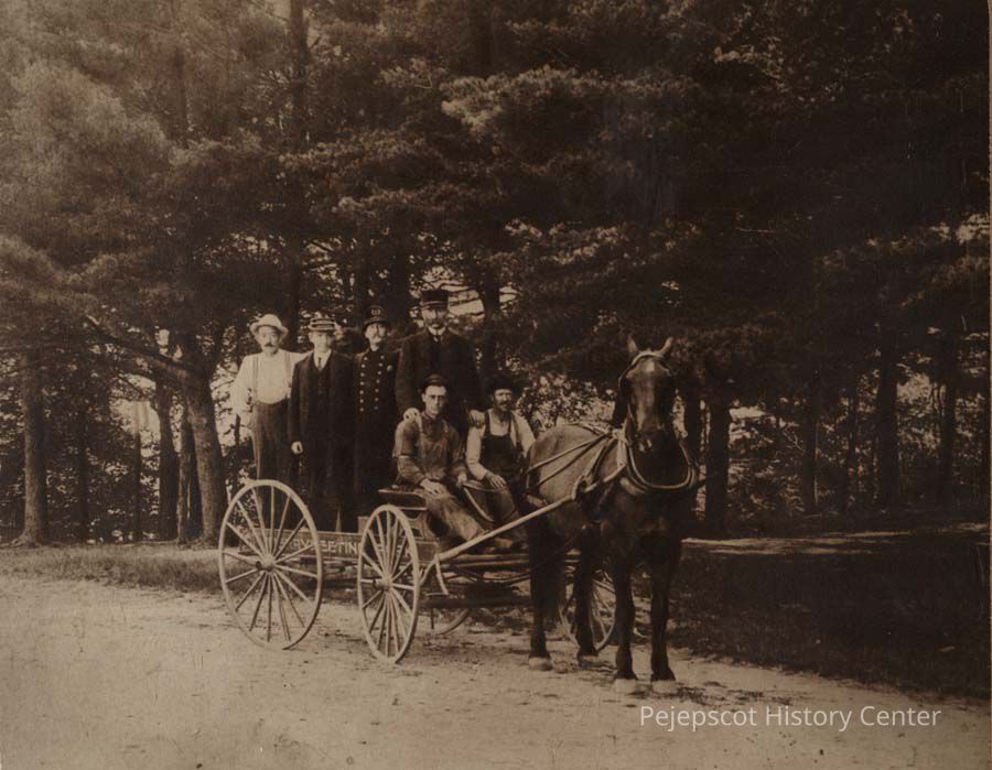 A B/W photograph of six men in a wagon. The sign on the wagon says "Merrymeeting Park". The wagon has larger back wheels and smaller front wheels. There is a photograph behind the one state. It is a group of young men.