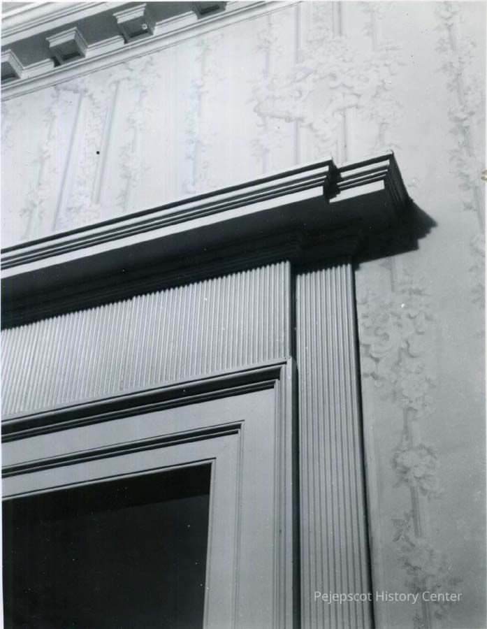 A B/W photograph of some details of an interior Moulding over a window at the Walker-Wilson house.