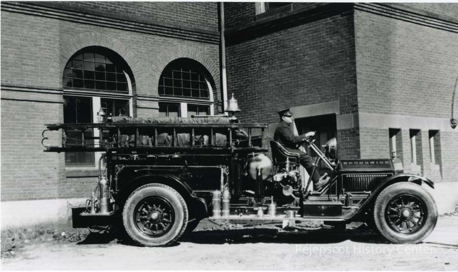 A B/W photograph of the "1919 Combination 1" fire truck. It was both a pumper and a chemical truck. William Lamarque is the driver.