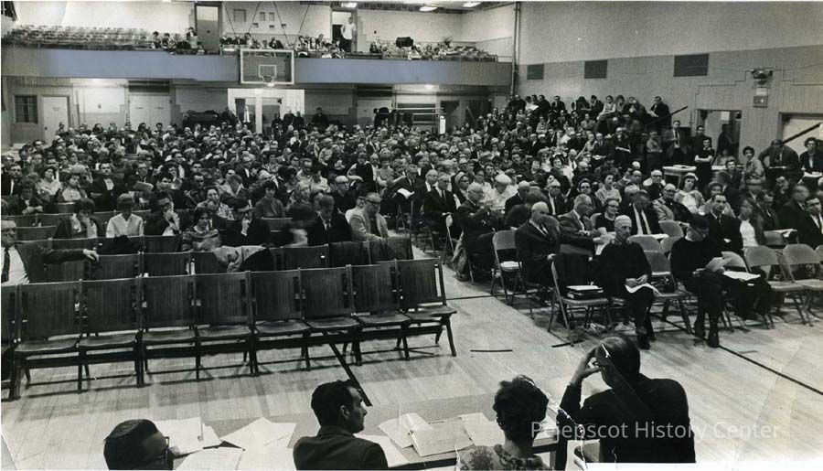 A B/W photograph of Brunswick's annual town meeting at the Brunswick High School. 3/5/1968