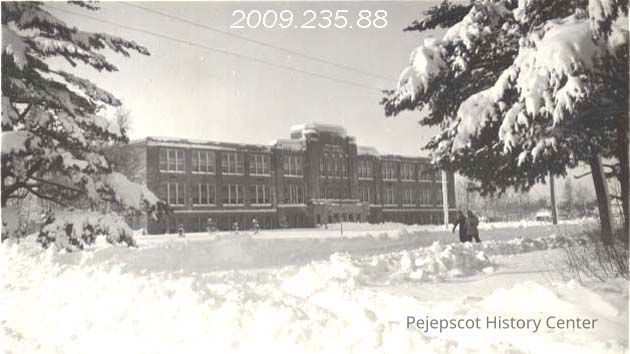 A B/W photograph of the Brunswick High School buried in snow. 01/1944