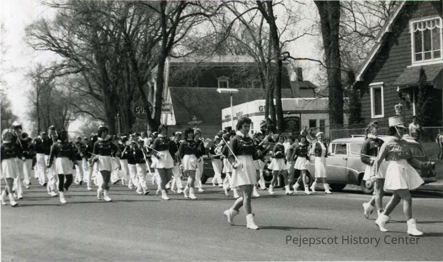 A B/W photograph of the Brunswick Junior High School band going north on Maine Street at Noble Street.. c. 1962.