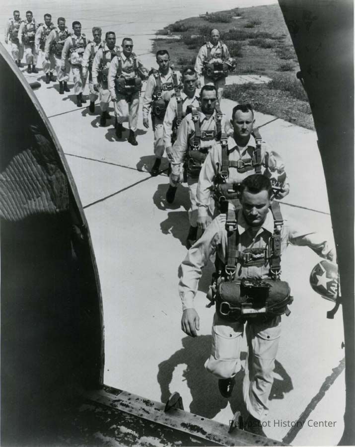 A B/W photograph of the "Chuting Stars" parachutists getting on a plane. Not for publication unless officially released.