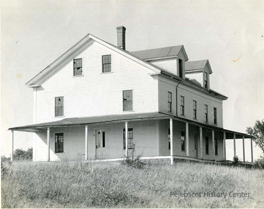 A B/W photograph of the Domhegan House which at one time was JL Chamberlain's summer home. It was also used by him as a hotel. The broken windows & geneally unkept appearance suggest this photo was taken after the hotel fell out of use.
