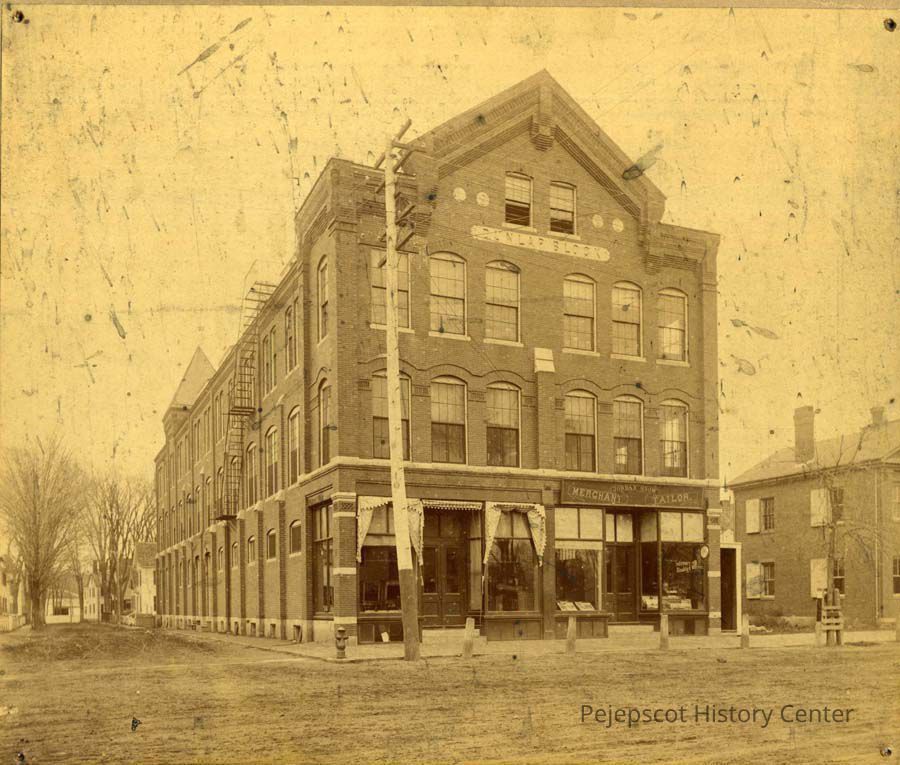 A B/W photograph of the Dunlap Block at the corner of Maine and Dunlap Streets..