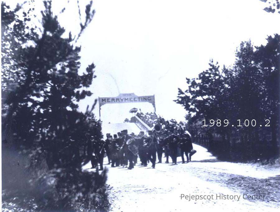 A B/W photograph of the entrance to Merrymeeting Park with a band playing there.