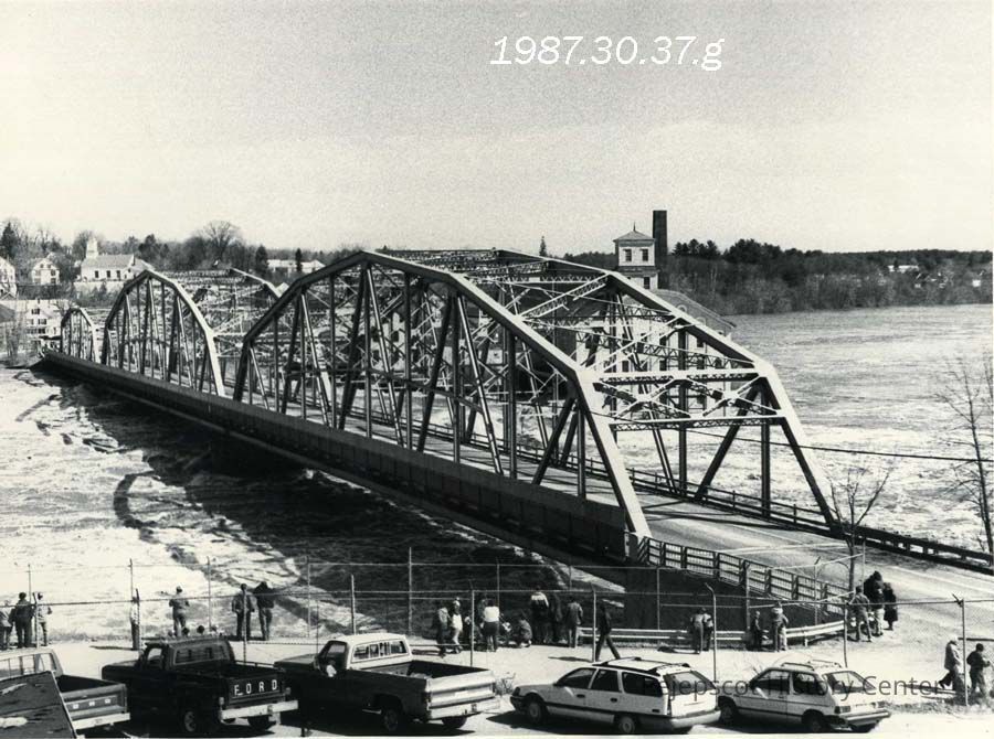 A B/W photograph of the Frank J. Wood Bridge and the Bowdoin Mill
