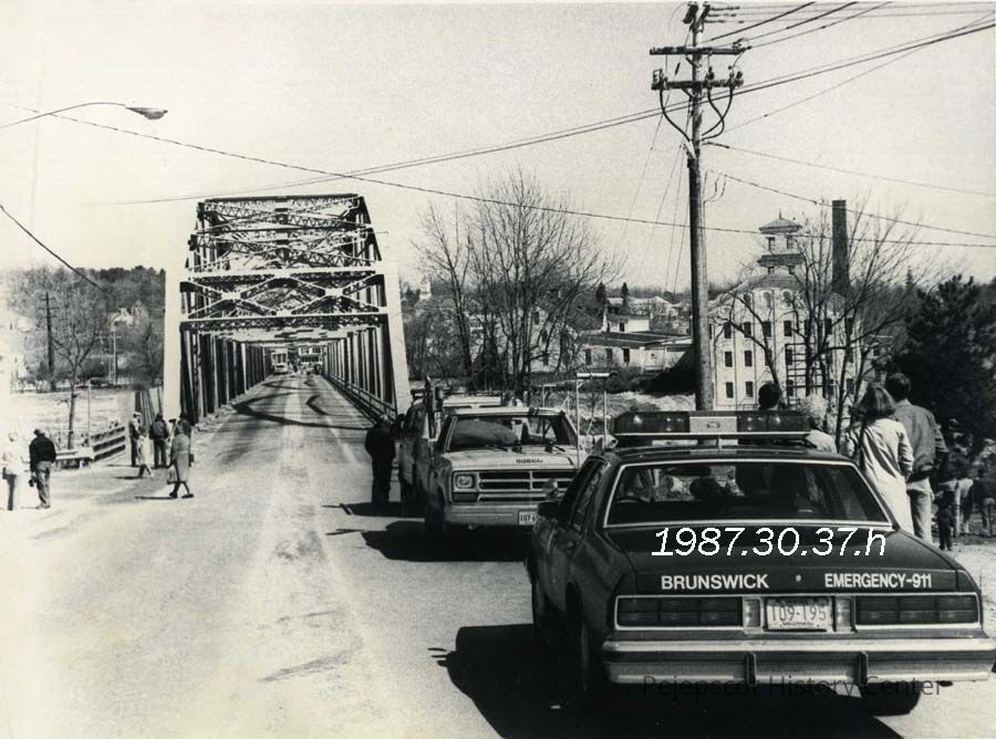 A B/W photograph looking thru the Frank J. Wood Bridge from Maine Street Brunswick.