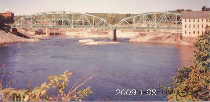 A color photograph of the Androscoggin River and the Frank S. Woods Bridge. The photo was taken from the Brunswick side of the river, looking upstream. The Bowdoin Mill can just be seen on the right and Fort Andross (Cabot Mill) on the left.