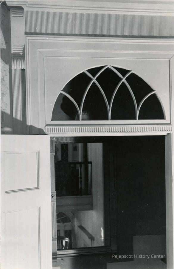 A B/W photograph of the glass over an interior door at the Porter House, Topsham.