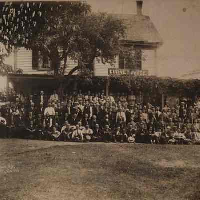 A B/W photograph of the Gurnet House. There are many people in front. In the back ground is a band with a drum marked "Brigade Lewiston, ME.