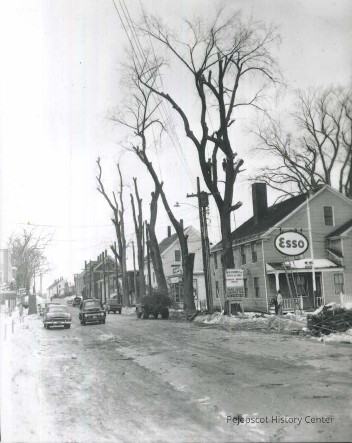 A B/W photograph of the houses on Mill Street that are to be demolished to make way for the Route 1 bypass. 3/1956.