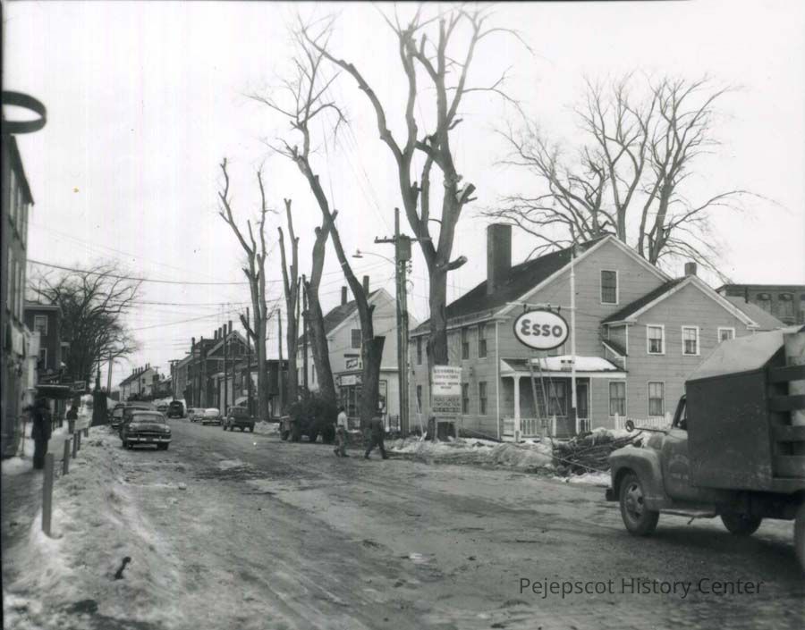 A B/W photograph of the houses on Mill Street that are to be demolished to make way for the Route 1 bypass. 3/1956.