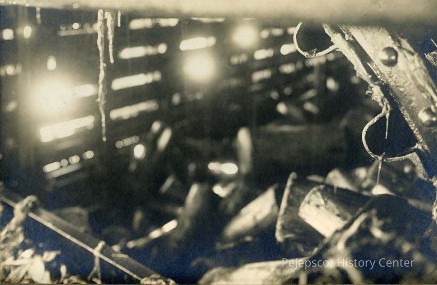 A B/W photograph of the interior of a drum debarker. It is used to remove the bark from wood by tumbling the wood against the drum.