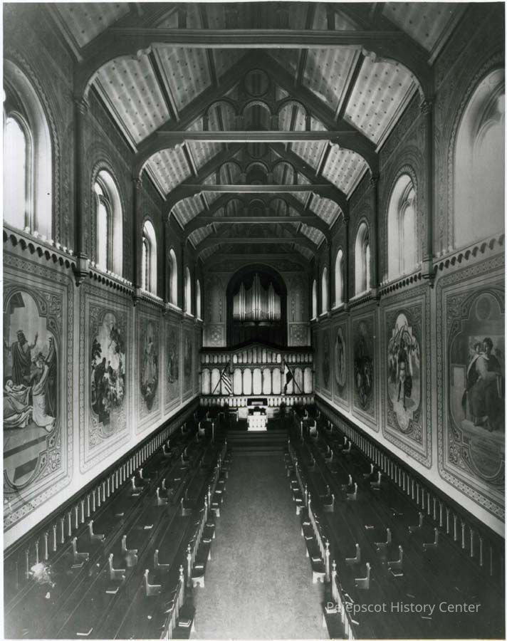 A B/W photograph of the interior of King Chapel, Bowdoin College.