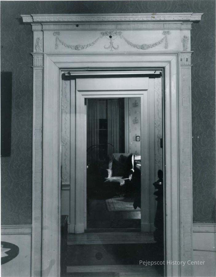 A B/W photograph of 2 interior doorways and their ornate trim at the Porter House in Topsham.