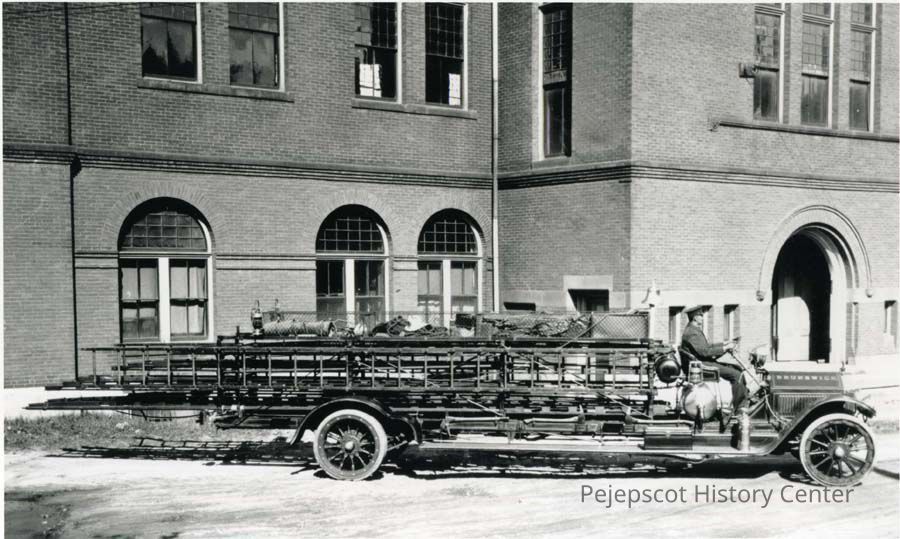 A B/W photograph of the Brunswick Fire Dept. "Ladder 1" fire truck. It is driven by Alfred LeTarte. The photo was taken in front of the Cabot Mill.