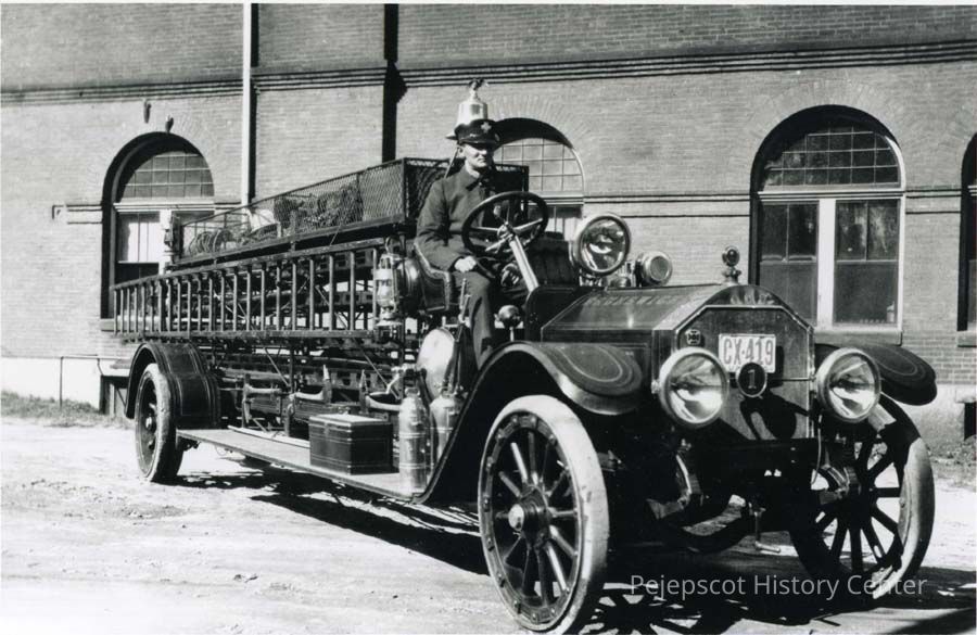 A B/W photograph of the Brunswick Fire Dept. "Ladder 1" fire truck. It is driven by Alfred LeTarte. The photo was taken in front of the Cabot Mill.